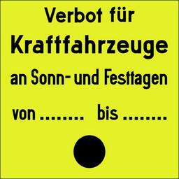 | Keywords: Verkehrszeichen - Verbot für Kraftfahrzeuge an Sonn- und Festtagen.svg de Verkehrszeichen Verbot für Kraftfahrzeuge an Sonn- und Festtagen Das Zeichen wurde als eines der wenigen Zeichen bereits vor 1927 reichsweit eingeführt Interpretation einer sehr freien historischen Vorlage Selbst gezeichnet und interpretiert durch Mediatus Mediatus 22 Juni 2016 + Signs User Mediatus/no-new-version Cc-zero PD-VzKat German language signs SVG road signs in Germany Diagrams of historic road signs of Germany 1925 set Motor vehicles forbidden signs |