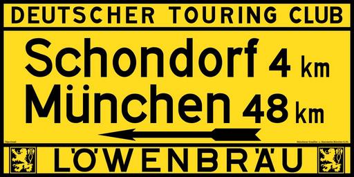 | Keywords: Verkehrszeichen - Wegweisertafel Schondorf-München, DTC.svg de Wegweisertafel nach Schondorf/München des Deutschen Touring Clubs In den 1920er Jahren stellte der Deutsche Touring Club mit Hilfe von Werbesponsoren Wegweisertafeln in den bedeutendsten Verkehrsregionen auf Die Datei entstand nach einem erhaltenen Originalschild aus Titan Emaille Nach Angeben des Besitzers 2012 stammt die rund 100 x 50 Zentimeter große Tafel aus Utting am Ammersee Auf der Vorderseite ist der Hersteller angegeben Münchener Emaillier- u Stanzwerke München S 25 Titan-Email Diese Fabrik bestand von ca 1913 bis 1964 Quelle https //web archive org/web/20160702143058/http //www schilderjagd de/verkehrsschild-mit-lowenbrauwerbung-aus-utting-am-ammersee-1930/ https //web archive org/web/20160702143058/http //www schilderjagd de/verkehrsschild-mit-lowenbrauwerbung-aus-utting-am-ammersee-1930/ Selbst gezeichnet und interpretiert durch Mediatus Mediatus 2016-02-07 other fields + Signs User Mediatus/no-new-version Cc-zero PD-VzKat Trademark Diagrams of historic road signs of Germany 1929 set Guide road signs in Germany German language signs SVG road signs in Germany Deutscher Touring-Club Black and yellow signs Löwenbräu |