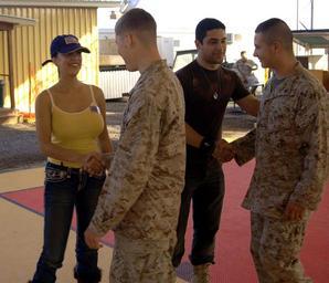 | Keywords: Veronica and Valderrama.jpg en Camp Lemonier DJ - Lance Cpl Brett Herman and Lance Cpl Juan Ortiz-Romero both assigned to 3rd Low Altitude Air Defense Battalion shake hands with model-actress Mayra Veronica and That 70's Show star Wilmer Valderrama during a USO show at Camp Lemonier Veronica Valderrama and world-famous comedian Russell Peters joined Vice Chairman of the Joint Chiefs of Staff Marine Gen James Cartwright on a Thanksgiving tour of military installations to entertain the troops http //www dvidshub net/index php script images/images_gallery php action viewimage fid 72258 Petty Officer 1st Class John Osborne 2007-11-23 Mayra VerĂ³nica Wilmer Valderrama PD-USGov-Military-Navy James E Cartwright Handshakes involving the military 3rd Low Altitude Air Defense Battalion |