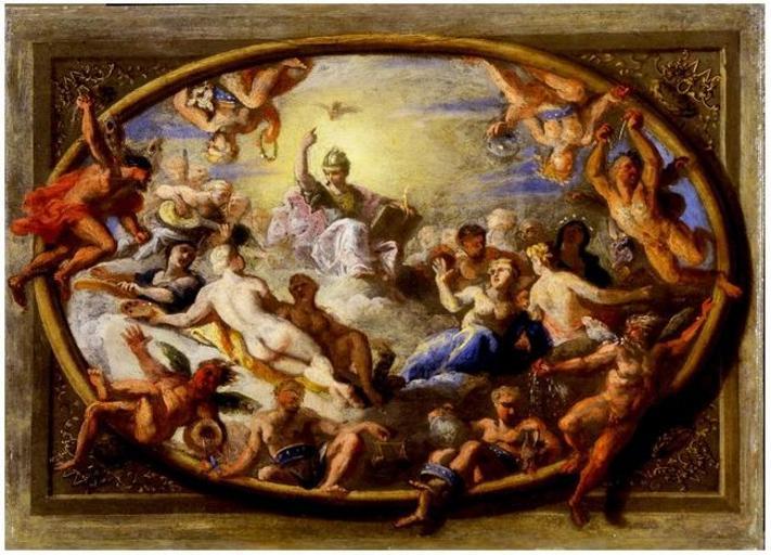 | Keywords: Verrio.jpg User Mifter/from commons Hampton Court Palace<br>Techniques - oil on paper mounted on panel<br>Place - London England <br><br> Dimensions - Height 34 3 cm unframed Width 49 8 cm unframed Depth 1 2 cm <br><br> Object Type - This is a preliminary study in effect the proposed design It was probably intended to be shown to William III to obtain his approval for the full-scale work The painting is not highly finished and its technique is relatively crude but very vigorous <br><br> People - Along with the architect Hugh May and the carver Grinling Gibbons Verrio was responsible for introducing to England the Baroque style of interior decoration that had developed in Italy and France His first commission from Charles II was the decoration of the staterooms at Windsor Castle and over the following 30 years he monopolised most of the important royal commissions In 1684 Verrio was appointed Principal Painter to the King <br><br> Subjects Depicted - Verrio shows the mythological figure of Minerva the goddess of Wisdom surrounded by allegorical figures representing Astronomy Music Poetry Architecture Sculpture and Painting This subject symbolised enlightened royal patronage of the Arts and Verrio has enlivened it with the dramatic gestures typical of his work original text 1 Antonio Verrio Museum no E 1085-1916 circa 1700 <br/> 2008 01 05 original upload date Creator Antonio Verrio Original uploader was VAwebteam at http //en wikipedia org en wikipedia PD-old-100 PD-old-100 original upload log page en wikipedia Verrio jpg 2008-01-05 12 34 VAwebteam 650×468× 74423 bytes <nowiki>Sketch for the Ceiling of the Banqueting House Hampton Court Palace about 1700 Antonio Verrio Museum no E 1085-1916 Techniques - oil on paper mounted on panel Place - London England Dimensions - Height 34 3 cm unframed Width 49 8 cm unframed </nowiki> source Creator Antonio Verrio Antonio Verrio Paintings of Minerva Oil on paper Banqueting House Hampton Court |