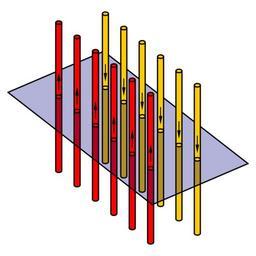 | Keywords: Vertical Wire Array.svg A diagram of 12 staggered parallel wires that carry current through a plane blue All the wires on one side red carry current upwards red all the ones of the other side carry current downwards yellow self-made Inkscape 09/11/2007 Inductiveload Magnetism |