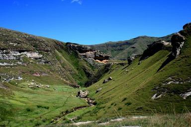 Keywords: very green valley grass meadow slopes mountains cleft ravine rocks sky summer