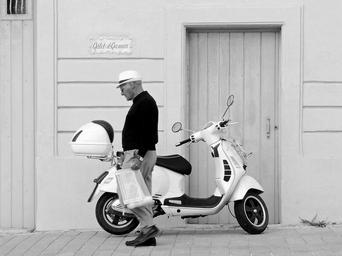Keywords: vespa scooter man walking motorcycle transport urban vehicle retro transportation street adult moped riding style motorbike people outdoors person classic cool bike lifestyle hat fashion male gentleman shopping shopping bag groceries mediterranean malta vespa scooter daily life village town wooden door parked 2 wheels white black