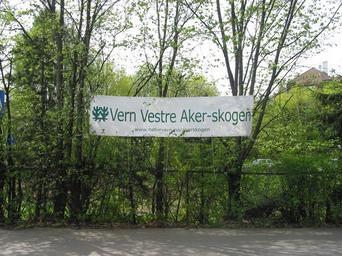 Keywords: Vestre Aker skog.jpg en A campaign banner put up by the Norwegian Society for the Conservation of Nature to preserve the forested area behind Vestre Aker Church own Punkmorten 2009-05-03 Vestre Aker kirke Environmentalism