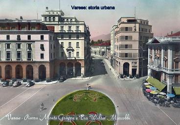 | Keywords: Versione colorata. Il rettifilo di via Marcobi: a sinistra palazzo Verga (ing. Mario Cantù) a destra l'edificio della RAS. In piazza Monte Grappa sulla destra palazzo Mascardi/Pini (ing. Camillo Lucchina, 1929). varese piazzamontegrappa viawaltermarcobi |