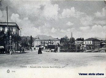 Keywords: Via Milano: in fondo la sagoma del Calzaturificio di Varese, a sinistra la stazione delle Ferrovie Nord Milano (1885), dietro le quali emergono le alte ciminiere dei Molini Marzoli Massari. varese