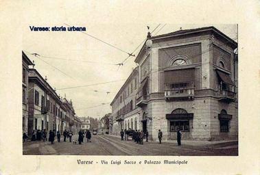 | Keywords: A sinistra Palazzo Estense (arch. Giuseppe Antonio Bianchi, 1766-73) e scorcio della casa Sacco/Ghirlanda (arch. Francesco Peverelli, 1808) sostituita nel 1964 dal palazzo della Banca d'Italia (arch. Ignazio Gardella). Di fronte la casa ad angolo che ospita l'albergo Europa (1855). In fondo a Palazzo Estense la filanda costruita nel 1837 e abbattuta nel 1932 e dietro l'edificio multipiano della scuola media che venne costruito nel 1903 e abbattuto negli anni '70. Sul fondo si intravede il parco di villa Baroggi. tram varese palazzoestense |