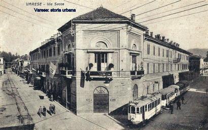 | Keywords: Al centro la casa d'angolo dell'albergo Europa (1855), a destra via Veratti e a sinistra via Sacco. In fondo a via Sacco si intravede il basso edificio della filanda costruita nel 1837 e abbattuta nel 1932 e dietro l'edificio multipiano della scuola media che venne costruito nel 1903 e abbattuto negli anni '70. tram varese |