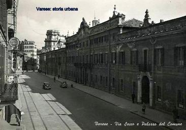 | Keywords: A destra Palazzo Estense (arch. Giuseppe Antonio Bianchi, 1766-73), segue casa Sacco/Ghirlanda (arch. Francesco Peverelli, 1808) sostituita nel 1964 dal palazzo della Banca d'Italia (arch. Ignazio Gardella). In fondo, in via Verbano (ora Marcobi) è quasi terminata la costruzione del palazzo della RAS. varese palazzoestense |