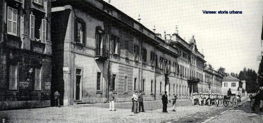| Keywords: Al centro Palazzo Estense (arch. Giuseppe Antonio Bianchi, 1766-73), a sinistra la casa Sacco/Ghirlanda (arch. Francesco Peverelli, 1808) sostituita nel 1964 dal palazzo della Banca d'Italia (arch. Ignazio Gardella). In fondo a Palazzo Estense la filanda costruita nel 1837 e abbattuta nel 1932. Sul fondo si intravede il parco di villa Baroggi con l'imponente portineria (ing. Giacomo Cova, 1890) ora scomparsa. varese palazzoestense | ||||