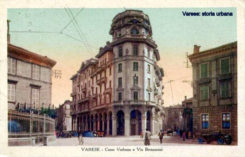 | Keywords: Versione colorata. In centro palazzo De Micheli e di seguito, affacciato su via Verbano (ora Marcobi), il palazzo della Banca Commerciale Italiana, entrambe sono opere della fine degli anni '20 dell'ing. Edoardo Flumiani. Segue la stretta casa Crugnola (ing. Zafferri) che si affaccia nel vuoto (sono visibili i lavori di demolizione delle vecchie case) in attesa della costruzione di palazzo Verga (ing. Mario Cantù). All'estrema destra uno scorcio di casa Sacco/Ghirlanda (arch. Francesco Peverelli, 1808) sostituita nel 1964 dal palazzo della Banca d'Italia (arch. Ignazio Gardella). varese viaverbano viawaltermarcobi |
