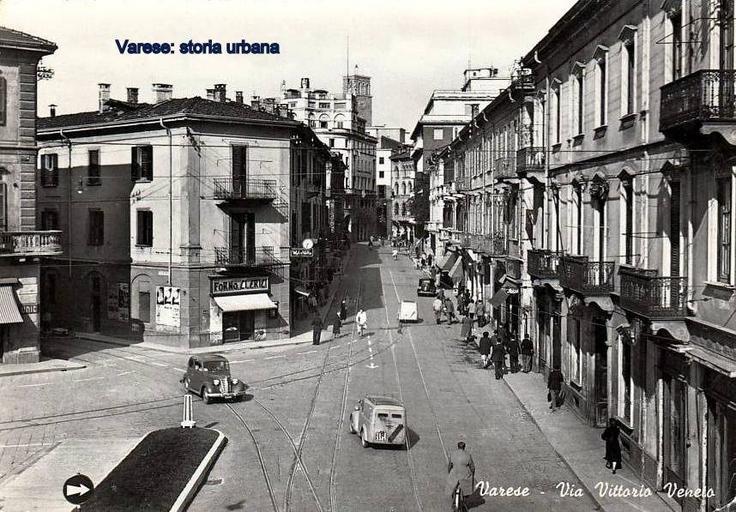 Keywords: Via Vittorio Veneto vista da piazza XX Settembre. L'edificio a sinistra che fa angolo con via Mazzini è stato sostituito negli anni '60 da un grande magazzino. L'edificio a destra, sede della Forzinetti Mario & Carlo (calzature) è stato abbattuto a fine anni '80. varese piazzaxxsettembre viavittorioveneto