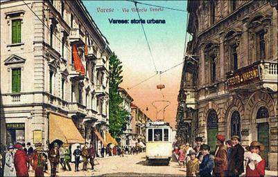 Keywords: Versione colorata. Vista della via con tram. A destra l'edificio del Credito Varesino. tram varese viavittorioveneto