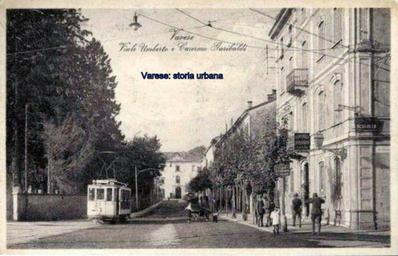| Keywords: Vista del viale, in fondo la caserma Garibaldi (arch. Silvio Spinelli, 1861) dove un paio di militari stanno per recarsi, a destra casa Marchesotti con l'imbocco di via Orrigoni. Sulla sinistra il parco della villa Dandolo, costruita trasformando radicalmente l'antico convento dell'Annunciata (1468). tram varese viamedagliedoro casermagaribaldi vialeumbertoi |