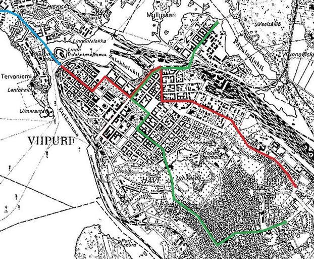 | Keywords: Viborg Tram Map.JPG en Vyborg tram route map in the 1930s Line 1 - red / Line 2 - green / Line 3 - blue fi Viipurin raitoliikenteen linjat 1930-luvulla Linja 1 punainen Raatihuoneentori - Ristimäki / Linja 2 vihreä Papula - Kelkkala / Linja 3 sininen Turun silta - Palotori 1939 Vyborg map 1939 National Land Survey of Finland other versions PD-Art Uploaded with UploadWizard Tram transport in Vyborg Maps of Vyborg Vyborg in the 1930s | ||||