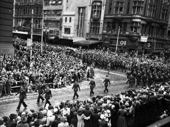 | Keywords: VIC1689Jeffrey1945.jpg Melbourne Vic 1945-08-24 Group Captain Peter Jeffrey DSO DFC extreme left and two other senior RAAF Officers leading the RAAF contingent of the combined march of RAAF and WAAAF personnel through the city area to commemorate Victory in the Pacific VP Day After marching down Collins Street the senior officers have turned into Swanston Street to pass the saluting base in front of the City Hall VIC1689 1945-08-24 Not stated PD-Australia the Government of Australia <small>Per the link above to the Australian government site where the image was found the Australian government considers this to be public domain worldwide http //www awm gov au/copyright/</small> World War II people of the Royal Australian Air Force Black and white photographs Peter Jeffrey RAAF officer |