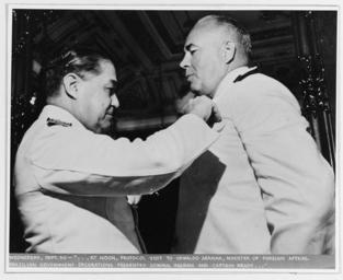 | Keywords: Vice Admiral Jonas H. Ingram.tif en A 30 September 1942 photograph taken as the Brazilian Minister of Marine Vice Admiral Guilhem was confering a decoration upon Vice Admiral Jonas H Ingram USN Secretary Knox was visiting Brazil during this time Portion of head in background is likely that of Oswaldo Aranha the Minister of Foreign Afffairs s 30 eptember 1942 http //www history navy mil/our-collections/photography/us-people/i/ingram-jonas-h-views-taken-1940-1943/nh-48323 html Secretary of the Navy Frank Knox other versions Custom license marker 2016 01 19 PD-USGov-Military-Navy Jonas Howard Ingram Black and white portrait photographs of men of the United States |