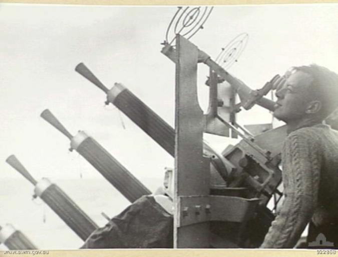 | Keywords: Vickers 50 cal HMAS Napier 1941 AWM 022858.jpeg Photograph of gunner aiming a 4-gun mounting of Vickers 50 anti-aircraft machine guns on Australian destroyer HMAS Napier 022858 1941-12 photographer not identified Copyright expired - public domain PD-AustraliaGov DEFAULTSORT Napier Vickers 50 machine gun HMAS Napier G97 Black and white photographs |