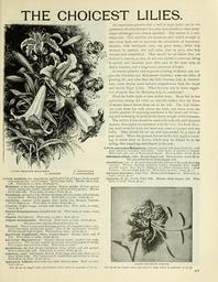 | Keywords: Vick's garden and floral guide (15943060513).jpg THE CHOICEST LILIES <br> LILIUM SPECIOSUM MELPOMENE <br> L AURATUM <br> L TENUIFOLIUM <br> L LONGIFLORUM <br> Lilium auratum the magnificent gold banded Lily of Japan freely spotted <br> with crimson red ; sweet scented Extra large bulbs Blooms about July <br> 15th Price each 20 cents ; dozen 2 00 <br> Batemani a beautiful Japanese variety; flowers upright of clear apricot <br> yellow strong and hardy; should have a place in every garden Blooms <br> about July 15th Price each 25 cents ; dozen 2 50 <br> Canadense our native Lily flowers drooping delicate scarlet yellow throat <br> spotted black Blooms July 10th Price each 15 cents ; dozen 1 25 <br> candidum common white garden Lily; hardy free bloomer fragrant <br> Ready August 1st Price each 10 cents; dozen Ji oo <br> croceum bright orange covered with black dots Pr ce each 20 cents; <br> dozen 2 00 <br> elegans atropurpureum beautiful dark red Price each 20 cents; dozen <br> £2 00 <br> elegans best light red Price each 15 cents ; dozen 1 50 <br> elegans incomparable Blood red Price each 15 cents; dozen 1 50 <br> The above five varieties bloom about July 1st <br> Hansoni This is a rare early flowering species of a beautiful yellow color <br> petals very thick dotted with purple One of the handsomest varieties <br> Blooms second week in June Price each 75 cents ; dozen 7 50 <br> Japonicum longiflorum white trumpet-shaped Blooms about 20th of <br> July Price each 15 cents ; dozen 1 50 <br> Leichtlini Maximowiczii Flowers salmon scarlet studded with large <br> purple dots Will become popular on account of its long season of bloom <br> from August and until frost comes Price each 30 cents <br> pardalinum the best of the Canadense class; yellow and red spotted <br> Blooms about July 10th Price each 20 cents ; dozen 2 00 <br> rubellum new bell-shaped flowers of fine deep pink color from two to <br> three inches long This variety and L tenuifolium are the first to bloom <br> Price each 25 cents ; dozen 2 50 <br> speciosum rubrum white and rose dark crimson spots Each 15 cents; <br> dozen 1 50 <br> For 1 00 at single rates purchasers may select to amount 0/ 1 25 <br> An impression prevails that a bed of regal Lilies can be the <br> possession of only a favored few who have wealth or other excep- <br> tional advantages less clearly specified This notion is a mis- <br> taken one The varieties are numerous and varied enough to <br> suit every taste and to preclude the probability of monotony <br> Anyone with intelligent care can grow them; while they <br> increase in number size and value year by year after ihey <br> become well established They should be set where they are <br> desired to remain as they do not take kindly to removal liking <br> to spread and luxuriate year after year in the same spot as <br> family treasure and a long-loved ornament of home <br> In stately splendor and exquisite coloring no flower can sur- <br> pass the Auratum and Melpomene varieties; none are fuller of <br> glowing life and color than the little Siberian Lily L tenuifol- <br> ium ; none display more barbaric magnificence than the single <br> and double Tiger Lilies What blossom can be more sugges- <br> tive of purity than the Madonna Lily L candidum <br> Plant the bulbs eight or nine inches deep Many fail in this <br> particular setting the bulbs so near the surface that the frosts <br> of winter almost throw them out of the soil The Lily throws <br> out roots from the stalk above the bulb and these serve the <br> double purpose of supplying nutriment to the plant and of brac- <br> ing and sustaining in position the heavy weight of the blossoms <br> The soil for Lilies should be made rich with old well-decayed <br> manure thoroughly incoqiorated with the soil ; but fresh dress- <br> ing must never be used nor must any come in contact with the <br> bulbs They should be set on and surrounded by a layer of <br> pure sand When the ground freezes in the fall apply a cover- <br> ing of stable litter or leaves which may be forked in in the <br> spring thus supplying enrichment to the soil <br> Lilium speciosum Melpomene crimson spotted with deep blood red each <br> petal distinctly bordered with white Same habit of growth as rubrum <br> Stems dark and color of flower much deeper Each 25 cents ; dozen 2 50 <br> speciosum album white Blooms August 15th Each 20 cents ; dozen 2 00 <br> The above four bloom about August 15th <br> tenuifolium one of the most beautiful and delicate of the early flowering <br> varieties Flowers dazzling vermilion scarlet suspended from slender <br> graceful stems; they are so bright as to attract attention from a great <br> distance Blooms about June 1st Price each 25 cents ; dozen 2 50 <br> tigrinum splendens Tiger Lily Blooms about August 1st Price each 10 <br> cents; dozen 1 00 <br> tigrinum fl pi double Tiger Lily Blooms about August 15th Price <br> each 15 cents; dozen 1 50 <br> LILIUM SPECIOSUM RUBKUM <br> For 2 00 at single rates purchasers may select to amount 0/ 2 J0 43864368 149533 78224 Page 67 Text http //www biodiversitylibrary org/page/43864368 1900 10 5962/bhl title 78224 Henry G Gilbert Nursery and Seed Trade Catalog Collection ; James Vick's Sons Rochester N Y NameFound Auratum NameFound Japonicum longiflorum NameFound Leichtlini NameFound Lilium auratum NameConfirmed Lilium auratum EOLID 1003309 NameBankID 5416786 NameFound Lilium candidum NameConfirmed Lilium candidum EOLID 1003297 NameBankID 2667845 NameFound Lilium speciosum NameConfirmed Lilium speciosum EOLID 1002931 NameBankID 5842543 NameFound Lilium tenuifolium NameConfirmed Lilium tenuifolium Fisch ex Hook f EOLID 1002501 NameBankID 11205210 Biodiversity Heritage Library Vick's garden and floral guide 1900 Garden Stories Catalogs Commerce Equipment and supplies Flowers Gardening James Vick's Sons Rochester N Y Rochester N Y Seeds Vegetables U S Department of Agriculture National Agricultural Library bhl pa