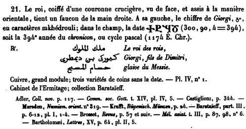 | Keywords: Victor Langlois.Le roi des rois, Giorgi fils de Dimitri, glaive du Messie 55 21.jpg fr Victor Langlois Le roi des rois Giorgi fils de Dimitri glaive du Messie 55 http //books google com/books id puYWAAAAYAAJ pg RA1-PA55 v onepage q f false Victor Langlois Numismatique de la Géorgie au Moyen âge P 55 1852 Victor Langlois 1829-1869 Source http //books google com/books id puYWAAAAYAAJ Numismatique de la Géorgie au Moyen âge by Victor Langlois PD-old Numismatique de la Géorgie au Moyen âge Victor Langlois Scans from Google Books |