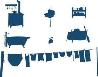 Keywords: victorian household blue silhouettes cutlery hearth iron oven pot sink tub washboard