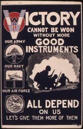 | Keywords: Victory cannot be won without more good instruments. Our army, our navy, our air force all depend on us. Let's give... - NARA - 535172.tif Scope and content General notes 535172 Local identifier 179-WP-1322 Office for Emergency Management War Production Board 01/1942 - 11/03/1945 Still Picture Records Section Special Media Archives Services Division NWCS-S National Archives at College Park 8601 Adelphi Road College Park MD 20740-6001 other date circa 1942 1943 Record group Record Group 179 Records of the War Production Board 1918 - 1947 Record group ARC 508 War Production Board compiled 1942 - 1943 Series ARC 533858 File unit File unit ARC Variant control numbers NAIL Control Number NWDNS-179-WP-1322 yes Other versions <gallery> File Victory_cannot_be_won_without_more_good_instruments _Our_army _our_navy _our_air_force_all_depend_on_us _Let's_give _-_NARA_-_535172 tif tif File Victory_cannot_be_won_without_more_good_instruments _Our_army _our_navy _our_air_force_all_depend_on_us _Let's_give _-_NARA_-_535172 jpg jpg </gallery> NARA-cooperation PD-USGov World War II posters from the United States NARA TIF images with categorized JPGs |
