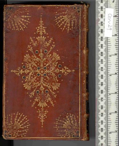 | Keywords: Vida y Hechos del Ingenioso Cavallero Don Quixote - Lower cover (Cerv29).jpg Style Centre and cornerpiece made of small tools; Caption Lower cover; Colour Red; Edge Gilt gauffered and painted exhibition history Decorative Technique Painted Tooled in gold; Cover Material Goatskin includes morocco turkey etc In poor condition With decorated paper endleaves From the Cervantes collection of Henry Spencer Ashbee With the name Caroline Reine painted on the fore edge may be Queen Caroline Decoration similar in style to that of Brindley object history Text 1719; Amberes; Caroline Queen Consort of George II King of Great Britain 1683-1737 object type Cc-zero place of creation Binding England place of discovery Unspecified British Library image http //www bl uk/catalogues/bookbindings/LargeImage aspx RecordId 020-000008290 ImageId ImageId 43750 Copyright BL Vida y Hechos del Ingenioso Cavallero Don Quixote Uploaded with GWToolset Vida y Hechos del Ingenioso Cavallero Don Quixote - Lower cover Cerv29 http //www webarchive org uk/bldatasets/bindings/8906_3 jpg Bookbinding 18th-century bookbinding British Library Bookbindings |