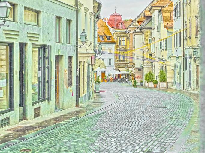 Keywords: VidGajsek - WAY US838.jpg en wet Upper Square traditional old catholic district of Ljubljana City Capital of Slovenia in Europe own Vid Gajšek 2012 Eleassar <sup> t/p </sup> 10 11 7 December 2012 UTC Upper Square Ljubljana Sett-paved streets in Ljubljana |