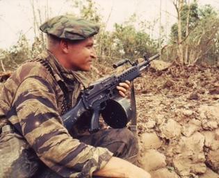 | Keywords: Vietnam p05.jpg A U S Navy SEAL in Vietnam keeps his Stoner 63A light machine gun at the ready while the rest of his squad prepares demolition charges on a Vietcong bunker Navy/National Archives 1968-03-26 Unknown PD-USGov Original upload log en wikipedia Magnus Manske CommonsHelper page en wikipedia Vietnam_p05 jpg 2009-04-21 20 51 Koalorka 500×407× 82319 bytes <nowiki> A U S Navy SEAL in Vietnam with the Stoner 63A LMG Navy/National Archives N/A Unknown </nowiki> Stoner 63 LMG Stoner 63 rifle United States Navy SEALs United States Navy in the Vietnam War Tigerstripe camouflage |