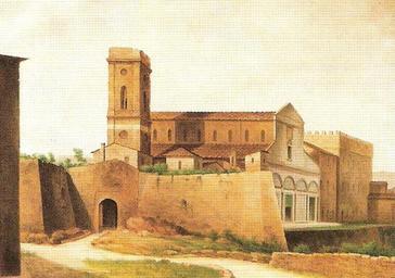 | Keywords: View of Ancient Florence by Fabio Borbottoni 1820-1902 (62).jpg Forte di San Miniato al Monte Since 1996 in Cassa di Risparmio di Firenze Collection century 19 creator Fabio Borbottoni Author died more than 70 years ago - public domain PD-old-100 Fabio Borbottoni San Miniato al Monte Florence - Exterior |