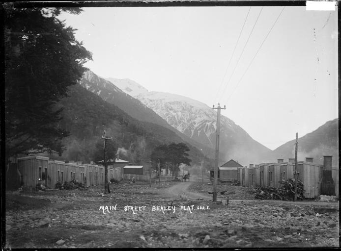 Keywords: blackandwhite monochrome outdoor photo border black and white View of Bealey Flat looking up Main Street. Two rows of huts line the street on either side, with larger buildings in the centre. Beyond Bealey Flat are snow-covered mountains. Photograph taken by William Archer Price ca 1910. Inscriptions: Inscribed - Photographer's title on negative -bottom centre: Main Street. Bealey Flat. 602.E. Quantity: 1 b&w original negative(s). Physical Description: Dry plate glass negative 4.5 x 6.5 inches View of Bealey Flat. Price, William Archer, 1866-1948 :Collection of post card negatives. Ref: 1/2-000380-G. Alexander Turnbull Library, Wellington, New Zealand. natlib.govt.nz/records/23018359 View of Bealey Flat looking up Main Street. Two rows of huts line the street on either side, with larger buildings in the centre. Beyond Bealey Flat are snow-covered mountains. Photograph taken by William Archer Price ca 1910. Inscriptions: Inscribed - Photographer's title on negative -bottom centre: Main Street. Bealey Flat. 602.E. Quantity: 1 b&w original negative(s). Physical Description: Dry plate glass negative 4.5 x 6.5 inches View of Bealey Flat. Price, William Archer, 1866-1948 :Collection of post card negatives. Ref: 1/2-000380-G. Alexander Turnbull Library, Wellington, New Zealand. natlib.govt.nz/records/23018359 |