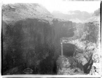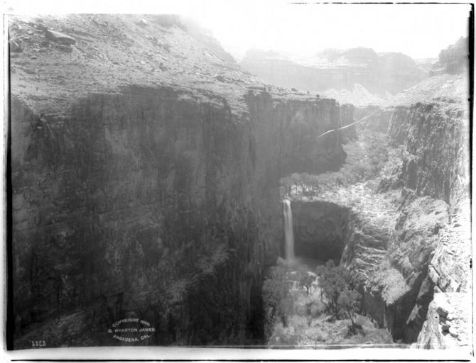 | Keywords: View from above towards Mooney Falls in Havasu Canyon, Grand Canyon, ca.1899 (CHS-3823).jpg en <br> View from above towards Mooney Falls in Havasu Canyon Grand Canyon ca 1899 Photograph of the view from above towards Mooney Falls in Havasu Canyon Grand Canyon ca 1899 The falls spills out in a narrow ribbon flowing towards the river visible through vegetation on the canyon floor far below Nearly vertical rocky walls hem the falls in The canyon rim is visible in the distant background Call number CHS-3823 Photographer James George Wharton Filename CHS-3823 Coverage date circa 1899 Part of collection California Historical Society Collection 1860-1960 Format glass plate negatives Type images Part of subcollection Title Insurance and Trust and C C Pierce Photography Collection 1860-1960 Repository name USC Libraries Special Collections Accession number 3823 Archival file chs_Volume95/CHS-3823 tiff Repository address Doheny Memorial Library Los Angeles CA 90089-0189 Geographic subject country USA Format aacr2 1 photograph photoprint b w ; 20 x 25 cm ; 1 photograph glass photonegative b w ; 17 x 22 cm Rights Digitally reproduced by the USC Digital Library; From the California Historical Society Collection at the University of Southern California Subject adlf canyons Repository email specol usc edu Contributing entity California Historical Society Date created circa 1899 Publisher of the digital version University of Southern California Libraries Format aat photographs Geographic subject state Arizona Legacy record ID chs-m16400 Access conditions Send requests to address or e-mail given Phone 213 821-2366; fax 213 740-2343 Geographic subject canyons Havasu Canyon; canyons Grand Canyon Subject lcsh Parks; Canyons; Waterfalls Subject Parks -- Grand Canyon -- Mooney Falls circa 1899 date created James George Wharton http //digitallibrary usc edu/cdm/ref/collection/p15799coll65/id/16339 PD-old-70-1923 Images from USC Digital Library uploaded by Fæ California Historical Society Collection 1860-1960 Glass plate negatives Photographs by George Wharton James |