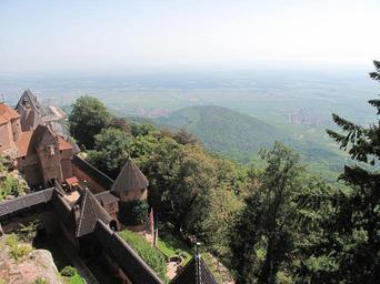 | Keywords: View from the grand bastion (Haut-Koenigsbourg).jpg en View from the grand bastion of the castle of Haut-Koenigsbourg Bas-Rhin France Below the upper garden the main entrance and the first entrance door In the background on the right the village of Saint-Hippolyte and on the left Orschwiller fr Point de vue depuis le grand bastion du château du Haut-Koenigsbourg En contrebas le jardin supérieur la porte principale et la première porte d'entrée Au loin à droite le village de Saint-Hippolyte et sur la gauche Orschwiller own Tangopaso 2011-08-22 13 01 22 48 249242 7 343148 region FR_heading E fr PA00084875 Grand bastion of the Haut-Koenigsbourg castle Views from the château du Haut-Kœnigsbourg Plain of Alsace |