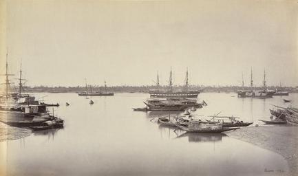 | Keywords: View from Hastings Bridge in Calcutta in the 1860s.jpg en View from Hastings Bridge from 'Views of Calcutta and Barrackpore' taken by Samuel Bourne in the 1860s Hastings Bridge crossed the Tolly Nullah a canal off of the Hooghly River was named after the Governor-General Marquis of Hastings 1813-1823 administration In 1874 this suspension bridge collapsed and was replaced by a stronger bridge A view looking towards shipping in the Hooghly The twin-funnelled paddle-steamer Mauritius and the three-masted sailing ship Bombay are moored in mid-stream s 1860 http //www oldindianphotos in/2009_02_15_archive html Creator Samuel Bourne other versions Custom license marker 2014 10 27 1912 Uploaded with UploadWizard Kolkata in the 1860s Samuel Bourne |