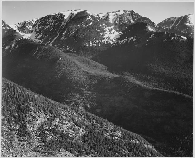 Keywords: View of hills and mountains, "In Rocky Mountain National Park," Colorado, 1933 - 1942 - NARA - 519956.tif Local identifier 79-AA-M03 Department of the Interior National Park Service Branch of Still and Motion Pictures - NARA-Author Adams Ansel 1902-1984 Photographer 1332556 <br /> Still Picture Records Section Special Media Archives Services Division NWCS-S National Archives at College Park 8601 Adelphi Road College Park MD 20740-6001 1933 - 1942 Record group Record Group 79 Records of the National Park Service 1785 - 2006 Record group ARC 408 Ansel Adams Photographs of National Parks and Monuments compiled 1941 - 1942 documenting the period ca 1933 - 1942 Series ARC 519830 Variant control numbers NAIL Control Number NWDNS-79-AA-M03 General notes Scope and content File unit File unit ARC yes <gallery> File View_of_hills_and_mountains _ In_Rocky_Mountain_National_Park _Colorado _1933_-_1942_-_NARA_-_519956 tif tif File View_of_hills_and_mountains _ In_Rocky_Mountain_National_Park _Colorado _1933_-_1942_-_NARA_-_519956 jpg jpg </gallery> NARA-cooperation PD-USGov Rocky Mountain National Park as photographed by Ansel Adams NARA TIF images with categorized JPGs |