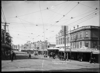 | Keywords: blackandwhite monochrome architecture outdoor photo border black and white View of the shops and commercial buildings at the Newton-end of Karangahape Road. The only identifiable businesses are The Frisco Candy Kitchen and British Photographic Studio. There are power posts up the middle of the road. Photograph taken ca 1900 by William A Price. Inscriptions: Inscribed - Photographer's title on negative -bottom centre: Karangahape Rd. Newton. 846. William Archer Price lived and practised in Queen Street, Northcote, 1909-1910. Source: New Zealand Post Office directories Quantity: 1 b&w original negative(s). Physical Description: Dry plate glass negative 4.75 x 6.5 inches View of Karangahape Road, Auckland. Price, William Archer, 1866-1948 :Collection of post card negatives. Ref: 1/2-001196-G. Alexander Turnbull Library, Wellington, New Zealand. natlib.govt.nz/records/22686552 View of the shops and commercial buildings at the Newton-end of Karangahape Road. The only identifiable businesses are The Frisco Candy Kitchen and British Photographic Studio. There are power posts up the middle of the road. Photograph taken ca 1900 by William A Price. Inscriptions: Inscribed - Photographer's title on negative -bottom centre: Karangahape Rd. Newton. 846. William Archer Price lived and practised in Queen Street, Northcote, 1909-1910. Source: New Zealand Post Office directories Quantity: 1 b&w original negative(s). Physical Description: Dry plate glass negative 4.75 x 6.5 inches View of Karangahape Road, Auckland. Price, William Archer, 1866-1948 :Collection of post card negatives. Ref: 1/2-001196-G. Alexander Turnbull Library, Wellington, New Zealand. natlib.govt.nz/records/22686552 |