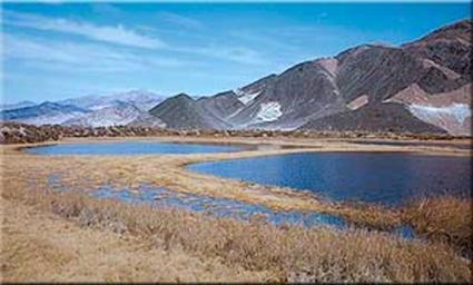 | Keywords: View north across Saratoga Spring ponds.jpg View north across Saratoga Spring ponds to hills consisting of late Precambrian Pahrump Group rocks White band is talc formed by reaction of dolomite with the black diabase enclosing it A sill of diabase magma intruded between sedimentary layers of Crystal Spring Formation now seen flanking the diabase at lower left All units now tilt to east right The spring water rises along a fault and becomes ponded by fringing barrier dunes NPS archive image moved here from the English Wikipedia http //en wikipedia org/wiki/Image Saratoga_Springs37sm jpg View north across Saratoga Spring ponds http //geomaps wr usgs gov/parks/deva/ftsar1 html 01/13/04 NPS archives PD-USGov Death Valley National Park Precambrian Pahrump Group rocks |