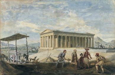 | Keywords: View of the Temple of Theseus by James Athenian Stuart.jpg en Temple of Theseus in Athens James Athenian Stuart uk Х ам Гефеста в Афінах Джеймс «Афінянин» Стюа т Ο ίνακας α εικόνιζει τον ναό του Θησείου Βλέ ουμε Αλβανούς χωρικούς να λιχνίζουν σιτηρά στο χώρο μ ροστά στον ναό ρίχνοντας τον καρ ό ψηλά ενώ φυσάει το μεσογειακό αεράκι Ένας Τούρκος υ ηρέτης μαζί με τον υιό του αφεντικού του του δίνουν εντολές τι να κάνει Ένας άλλος Αλβανός μαζί με την γυναίκα του και το αιδί του κάθονται κάτω α ό τον ίσκιο ενός λυόμενου υ όστεγου ου το ονομάζουν «καλύβι» Οι Αλβανοί είναι χριστιανικός ορθόδοξος ληθυσμός ου ασχολείται με την γεωργία και ομιλούν την δική τους γλώσσα Το υ έδαφος μ ροστά στο ναό έχει διαβρωθεί α ό τις βροχές και φαίνονται ο στερεοβάτης Στο βάθος διακρίνουμε τον Υμηττός και τα Τουρκοβούνια Α ό την άλλη μεριά ο Κηφισός οταμός ρέει στην κοιλάδα των Πατησίων http //www vam ac uk/images/image/50996-popup html Creator James Stuart 1750-60 Historical images of Temple of Hephaestus in Athens James Stuart 1713-1788 PD-old-100 |