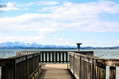 Keywords: viewpoint telescope web landscape chiemsee lake water nature bavaria mountains blue clouds distant vision view distant view winter wide