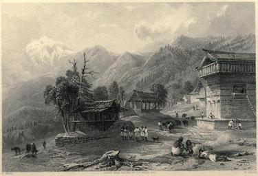 Keywords: Views in India 0122a.jpg en Village of Khandoo on the Choor mountain 1838 https //archive org/details/viewsinindiachie00whitrich George Francis White other versions PD-old-70-1923 Views in India chiefly among the Himalaya Mountains