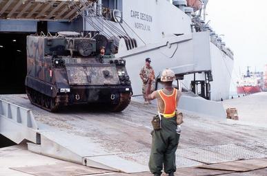 | Keywords: Vigilant Warrior unloading.JPEG M577 command and control vehicle rolls off the Military Sealift Command ship MV Cape Decision at a port facility in the Arabian Gulf region on 19 Oct 1994 The Ready Reserve Force ship and the equipment being unloaded as part of Operation Vigilant Warrior the U S Armed Forces response to aggressive Iraqi actions towards Kuwait J3301-SPT-5-02-CE008 http //www defenseimagery mil/imagery html;jsessionid DE669C813ABF951EF82B5B6C16EA6710 guid 598ce7f41210d87d901d661b42b99c2232ed8c4a A1C Conrad M Evans II 1994-10-19 M577 Command Post Carrier Sealift ships Military operations PD-USGov-Military-Navy Operation Vigilant Warrior 1994 |