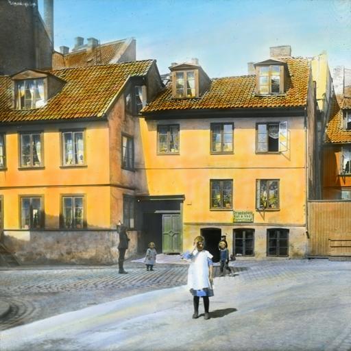 | Keywords: jenter barn gater bygårder bybebyggelse foretninger kull ved oslo norge nor outdoor architecture building Håndkolorert dias. En jente kledd i kjole står på gata foran en bygård i Vika, Oslo, i 1904. I bakgrunnen står tre andre små barn og en ung gutt. På bygården henger et skilt for "Strandgadens Kul og Ved-Forretning". Håndkolorert dias. En jente kledd i kjole står på gata foran en bygård i Vika, Oslo, i 1904. I bakgrunnen står tre andre små barn og en ung gutt. På bygården henger et skilt for "Strandgadens Kul og Ved-Forretning". |