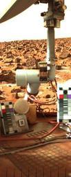 | Keywords: Viking2-PIA00573.jpg Mars Viking 22e169 png Higher quality image Viking-2 picture; http //photojournal jpl nasa gov/catalog/PIA00573 ; Original Caption Released with Image <br>Photo from Viking Lander 2 shows late-winter frost on the ground on Mars around the lander The view is southeast over the top of Lander 2 and shows patches of frost around dark rocks The surface is reddish-brown; the dark rocks vary in size from 10 centimeters four inches to 76 centimeters 30 inches in diameter This picture was obtained Sept 25 1977 The frost deposits were detected for the first time 12 Martian days sols earlier in a black-and-white image Color differences between the white frost and the reddish soil confirm that we are observing frost The Lander Imaging Team is trying to determine if frost deposits routinely form due to cold night temperatures then disappear during the warmer daytime Preliminary analysis however indicates the frost was on the ground for some time and is disappearing over many days That suggests to scientists that the frost is not frozen carbon dioxide dry ice but is more likely a carbon dioxide clathrate six parts water to one part carbon dioxide Detailed studies of the frost formation and disappearance in conjunction with temperature measurements from the lander ™s meteorology experiment should be able to confirm or deny that hypothesis scientists say Image Note 22E169/377 http //www jpl nasa gov/images/policy/ JPL Image Policy credit line Courtesy NASA/JPL-Caltech PD-USGov Original upload log page en wikipedia Viking2-PIA00573 jpg 2004-05-05 19 59 Wwoods 206×512×8 23777 bytes <nowiki>Viking-2 picture; http //photojournal jpl nasa gov/catalog/PIA00573 ; msg PD </nowiki> Viking mission September 1977 photographs 1977-09-25 1977 in spaceflight |