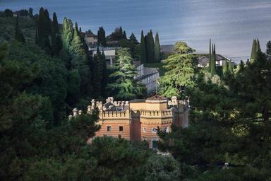 Keywords: villa castle dream home hotel garda lake italy panorama landscape recovery holiday outlook trees park evening sun shadow