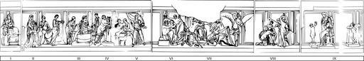 | Keywords: Villa dei Misteri - Sala del Grande Dipinto - Scene Sequence.svg Le religioni misteriche nell'antichità greco-romana erano delle sette religiose che promettevano ai loro aderenti di interrompere prima del tempo il ciclo di reincarnazioni in nuovi corpi al quale tutti gli esseri umani erano condannati nelle loro vite terrene al fine di liberarsi dall'elemento titanico materiale e malvagio di cui sono formati e di ritornare prima della fine del ciclo universale di 12 000 anni fra gli dei dei quali essi fanno parte grazie all'altro elemento che li compone quello divino la parte spirituale e buona dell'essere umano Sulle pareti del triclinio della Villa dei Misteri a Pompei è rappresentato caso unico in tutto il mondo antico il rito di iniziazione di una giovane donna ai misteri orfico-dionisiaci rito che - dopo un lungo periodo di formazione - le permetteva di entrare a pieno titolo a far parte della comunità e soprattutto dopo la sua morte di essere accolta nell'Olimpo fra gli altri dei anziché di tornare nell'Ade fra le anime dei comuni mortali che presso il fiume infernale Lete dovevano attendere mille anni prima di reincarnarsi in un nuovo corpo e ritornare a vivere sulla Terra Nel ciclo pittorico affrescato si riconoscono in nove quadri i sette momenti principali del rito di iniziazione 1 IX la VESTIZIONE dell'inizianda per le nozze mistiche col dio; 2 II la CATECHESI o lettura del rituale; 3 III l'AGAPE fraterna; 4 IV la COMUNIONE col dio; 5 V-VI l'ANNUNCIAZIONE di morte; 6 VII la beatitudine divina Dioniso ed Arianna ; 7 VII-VIII la PASSIONE; 8 VIII la RESURREZIONE; 9 I la domina-sacerdotessa che assiste con attento distacco a tutto lo svolgimento del rito en Scene sequence of frecoes in the Sala del Grande Dipinto in the Villa dei Misteri in Pompeii de Szenefolge der Fresken im Sala del Grande Dipinto in der Villa dei Misteri in Pompeij Own WolfgangRieger Frescos of the mystery ritual 09 |