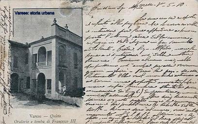 | Keywords: Scorcio di villa Quiete, appartenuta ai Sanvito, sorta trasformando il precedente convento dei frati cappuccini (trasferitì lì dal vicino monastero vecchio nel 1689). I Sanvito, acquistato il convento nel 1799, avevano parzialmente demolito la chiesa dei cappuccini, dedicata a San Bartolomeo, dove era sepolto dal 1780 il duca Francesco III d'Este, la cui salma venne traslata in un piccolo oratorio (quello illustrato in foto) ricavato dal coro della vecchia chiesa (in seguito i resti vennero trasferiti al nuovo cimitero di Giubiano), mentre sembra che i suoi visceri vennero sepolti nel giardino, ai piedi di un rialzo circondato da cinque alti cipressi. La villa Quiete, molto trasformata, è ora sede del liceo classico. Il nome "La Quiete" è ora utilizzato dalla clinica installata nella sovrastente villa Barbò-Leonino.