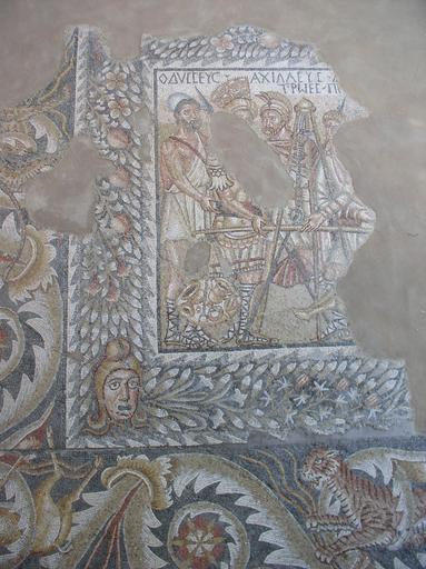 Keywords: Villa romana del Tellaro 001.jpg Détail de la mosaïque de la restitution du corps d'Hector dans la villa romaine de Tellaro à Noto Syracuse La scène est inspirée du chant XXIV de lIliade Les personnages sont identitiés par des inscriptions en grec ancien Dettaglio del Mosaico del riscatto del corpo di Ettore della villa romana del Tellaro a Noto Siracusa Own Gmelfi Villa Romana del Tellaro Noto - Hector mosaic Iliad Odysseus in ancient Roman mosaics Ancient Greek inscriptions in Syracuse Scales in art Achilles in ancient Roman mosaics |
