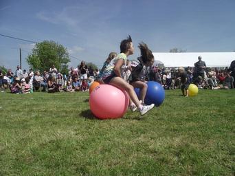 Keywords: village fair bouncy ride children playing pylon wire sit