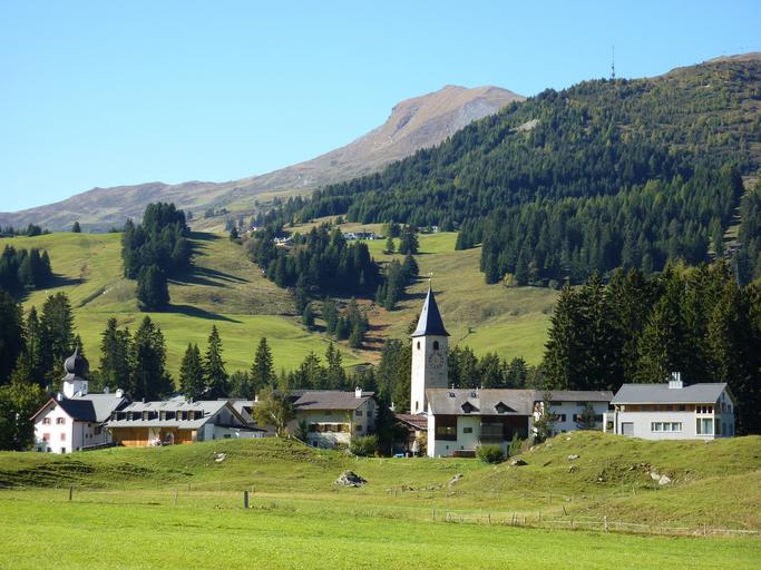 Keywords: village steeple church sky parpan switzerland pasture hill homes region