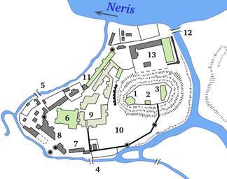 | Keywords: VilniusCastle.svg Aukštutinė pilis 1 vakarinis bokštas; 2 pietinis bokštas išlikę pamatai ; 3 rūmai likę griuvėsiai Žemutinė pilis 4 vartai ir tiltas į miestą Pilies gatvę ; 5 kelias ir tiltas į Tilto gatvę; 6 arkikatedra; 7 Vyriausiojo tribunolo rūmai; 8 Vyskupų rūmai; 9 Valdovų rūmai; 10 rūmų sodas; 11 rūmų pastatas nuo XVIII a pab arsenalas dabar muziejus; 12 šiaurės rytų bokštas ir arsenalo vartai; 13 arsenalo kiemas 2005-12-28 own assumed Knutux History of Vilnius Maps of Vilnius Plans of Vilnius Castle |